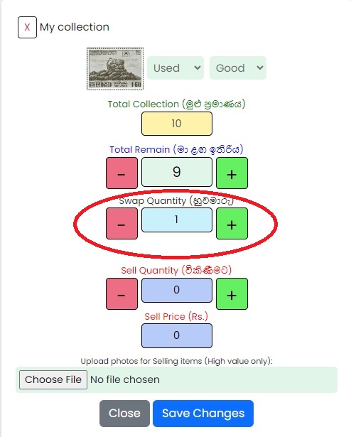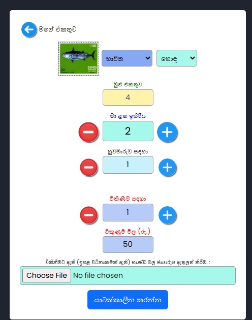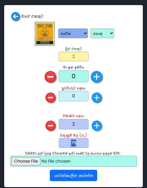 සටහන: මෙම යාවත්කාලීන කිරීම ආපසු හැරවිය නොහැකි බැවින් කරුණාකර එය ප්රවේශමෙන් කිරීමට වග බලා ගන්න. මානව දෝෂ අවම කිරීම සඳහා අපි මෙම යාවත්කාලීන කිරීම එකවර උපරිම අයිතම 200 කට සීමා කර ඇත්තෙමු.. මෙය දැනට මුද්දර / මුල්දින කවර / සිහිවටන පත්ර / කුඩා පත්ර සඳහා පමණක් ලබා ගත හැකිය. වඩා හොඳ අදහසක් ලබා ගැනීමට කරුණාකර පහත පින්තුර අධ්යනය කරන්න .