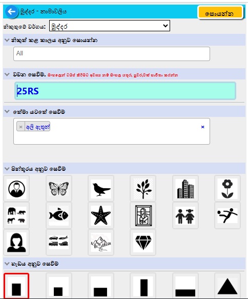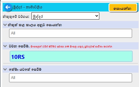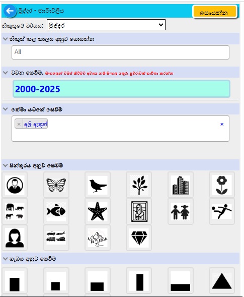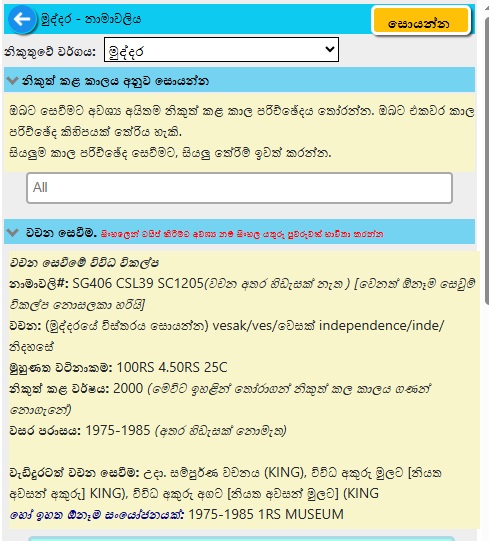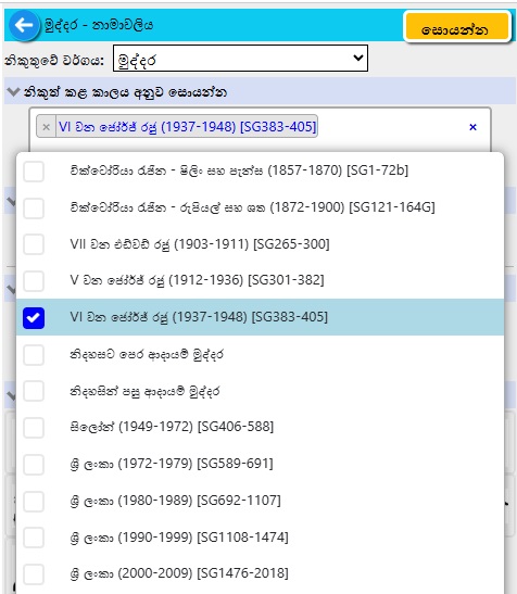 සෙවීමට බොහෝ විකල්ප තිබේ...නාමාවලිය#, නිකුතු වර්ගය, නිකුත් කරන ලද කාල සීමාව, විස්තරයේ ඇති වචන, තේමාව, මුහුණත වටිනාකම, වර්ණය, පින්තූර වර්ගය, හැඩය හෝ සියල්ලේ එකතුවකි