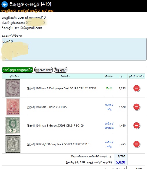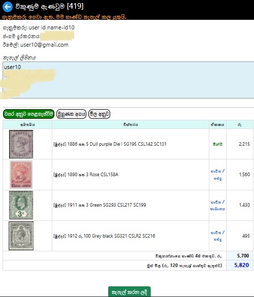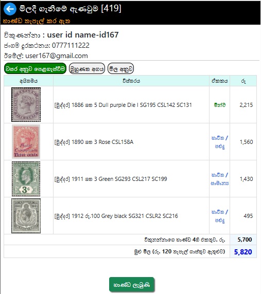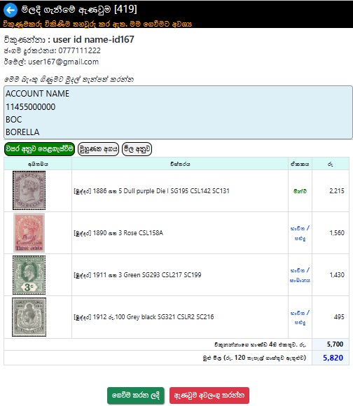 ගැනුම්කරුට මුදල් ගෙවීම සඳහා විකුණුම්කරු තැපැල් ගාස්තු සහ බැංකු විස්තර ඇතුළත් කළ යුතුය..