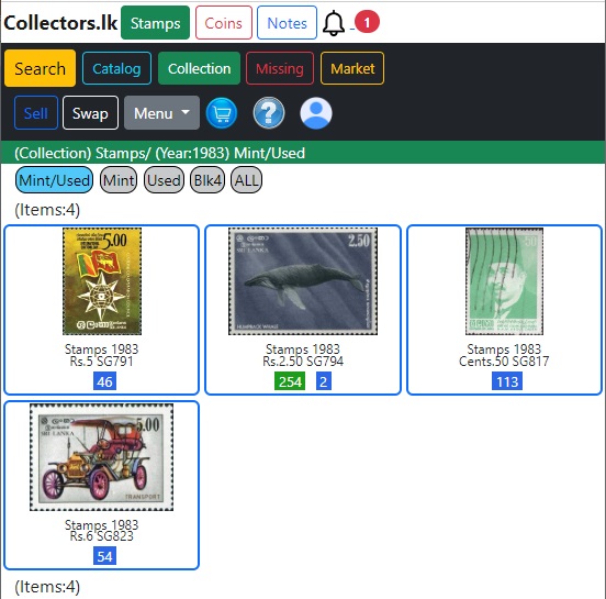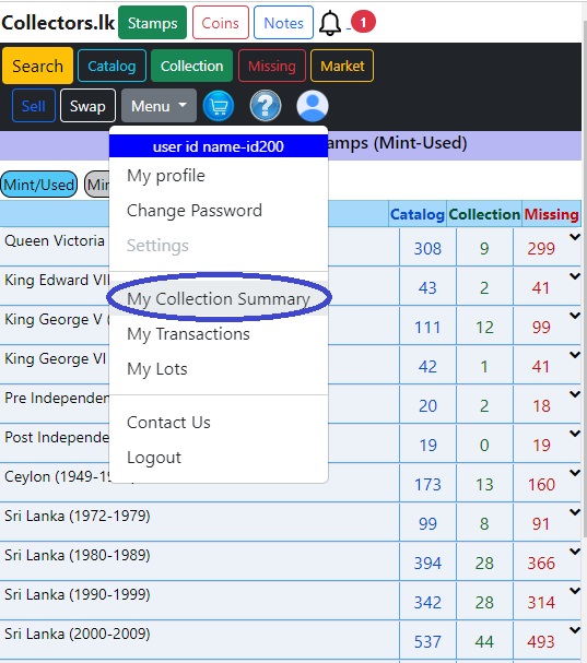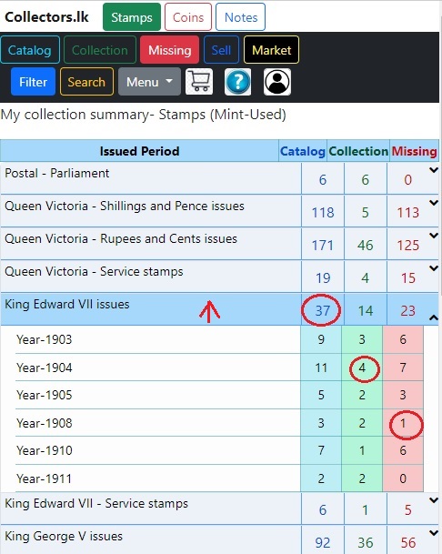 නිකුත් කරන ලද කාලපරිච්ඡේදය අනුව සාරාංශය පෙන්වා ඇත. නාමාවලියෙහි ඇති අයිතම ගණන, මගේ එකතුවේ ඇති අයිතම ගණන සහ මගේ එකතුවේ නොමැති අයිතම ගණන. ඔබ 'නිකුත් කළ කාලය' මත කිල්ක් කල විට වසර අනුව සවිස්තරාත්මක සාරාංශයක් පෙන්වනු ලැබේ. එම කාල පරිච්ඡේදයට/වසරට අදාළ අයිතම බලාගැනීමට අංකයක් මත කිල්ක් කරන්න. ඔබට භාවිතා කළ හෝ මින්ට් හෝ 'භාවිතා කළ+මින්ට්' එකතුව වෙන වෙනම තෝරාගත හැක.